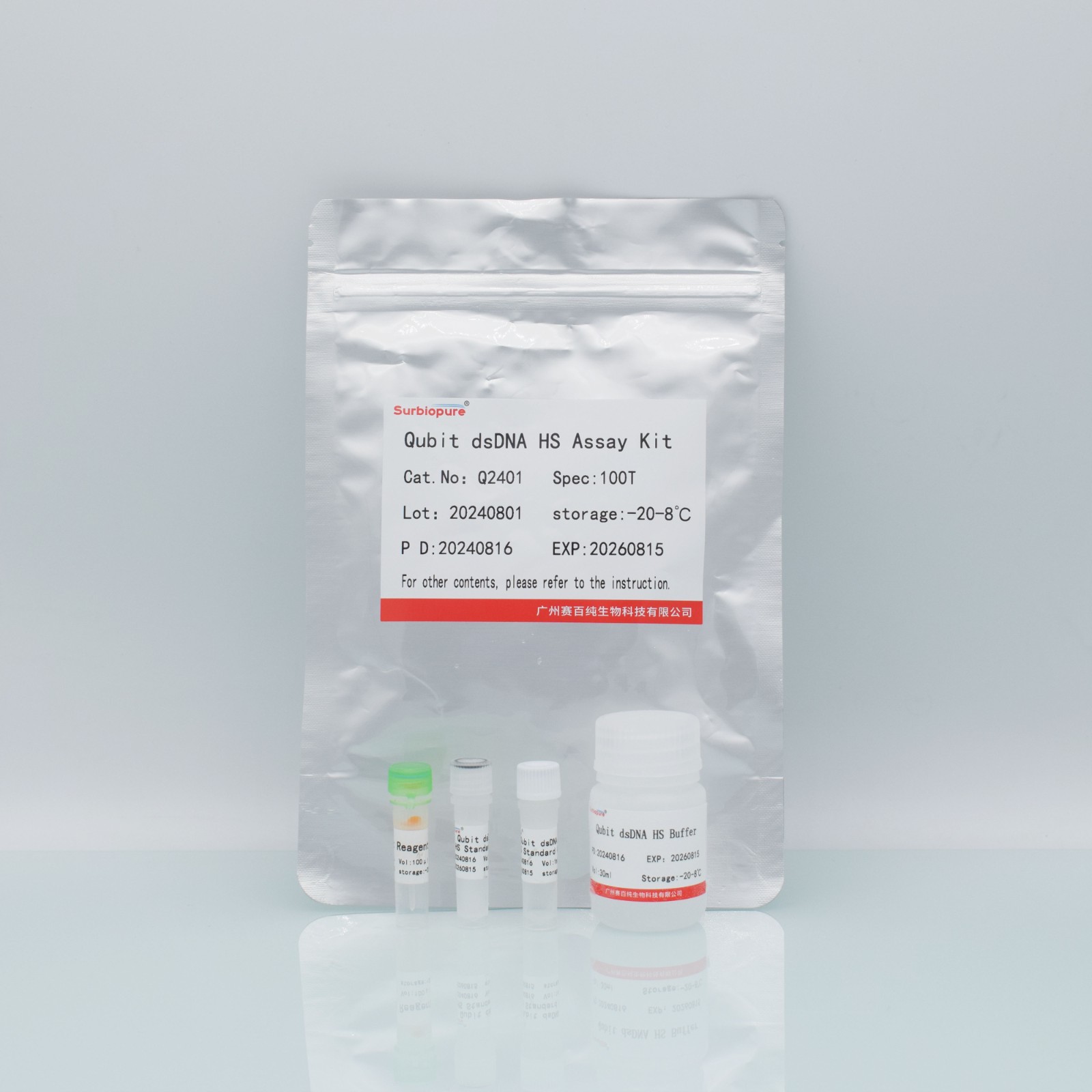 【產品名稱】通用名稱:雙鏈DNA超敏檢測試劑盒(熒光法)英文名稱:Qubit? dsDNA HS Assay Kits【包裝規格】100 份&500 份/盒【檢驗原理】本試劑盒利用Picogreen DNA染料能夠特異性結合雙鏈DNA,而不與蛋白質、RNA、鹽離子結合的原理,通過激發光照射,Qubit檢測儀收集發射光,特異的分析樣品中雙鏈DNA的實際含量,能夠排除樣品中蛋白質、RNA、鹽離子等物質的干擾,從而對雙鏈DNA進行精準的定量。